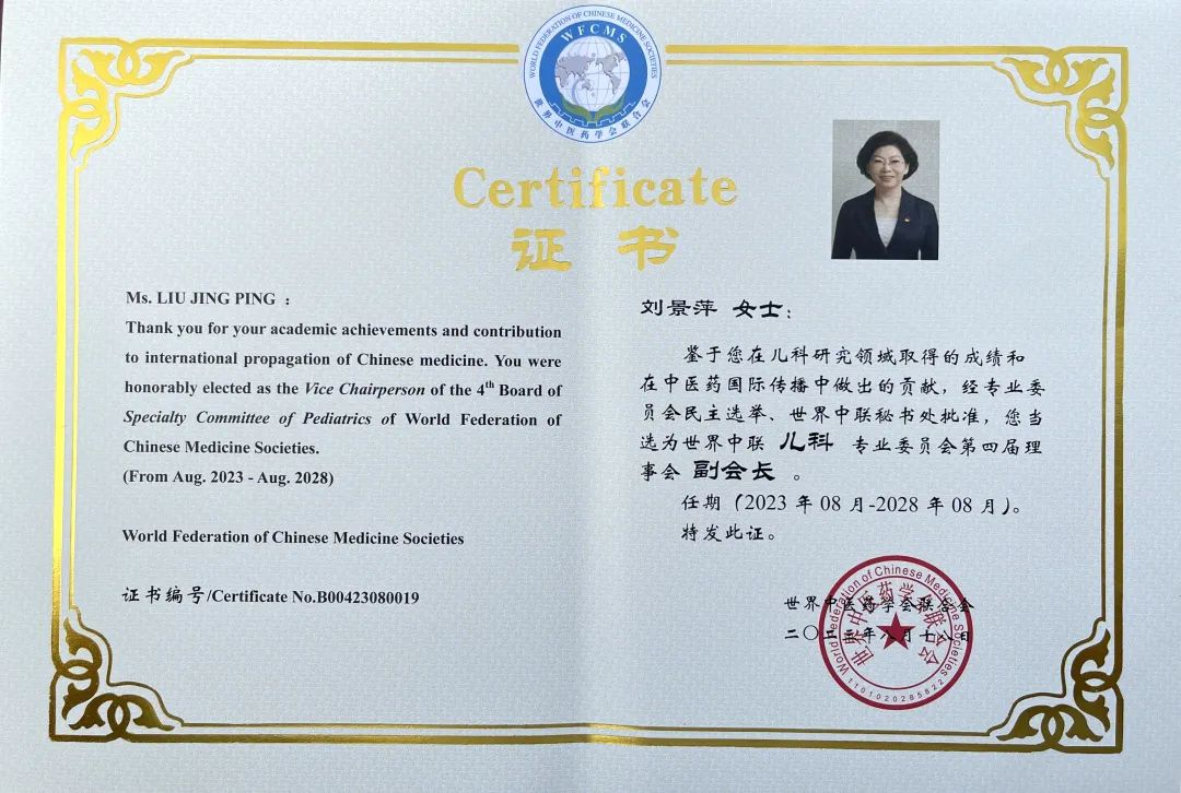 九游会药业集团党委书记、董事长刘景萍当选世界中医药学会联合会儿科专业委员会第四届理事会副会长